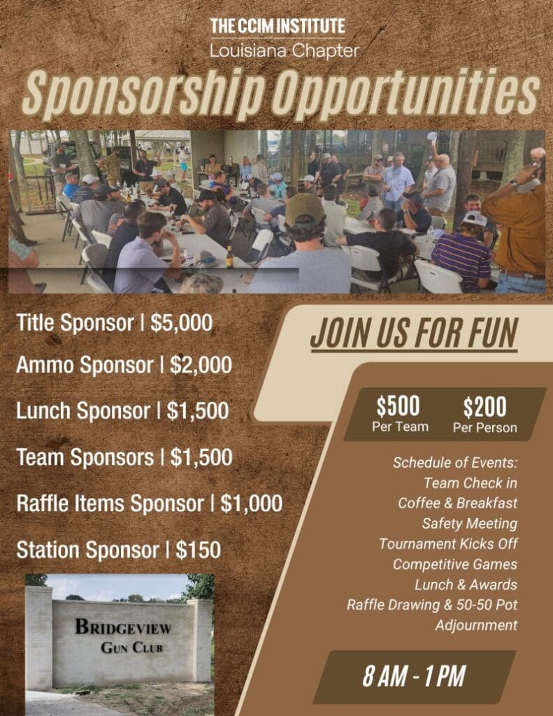 Join us at the 3rd Annual Clay Shoot Tournament, hosted by the CCIM Institute, Louisiana Chapter. The sporting clay tournament is a fun, outdoor event where participants test their skills in a friendly competition while enjoying time with colleagues and peers in the commercial real estate community.