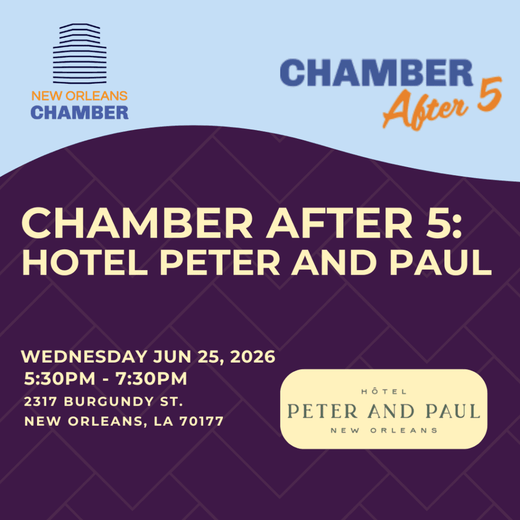 Join us at the New Orleans Chamber of Commerce Chamber After 5 at the Hotel Peter and Paul! This evening networking event was designed to bring together up to 400 professionals from a wide range of industries for high-quality, strategic networking in a relaxed environment.